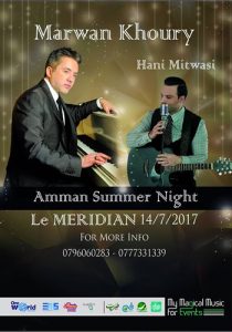 My Magical Music for Events Presents Amman Summer Night - With The Multitalent Artists , The Lebanese Star Marwan Khoury & The Jordanian Star Hani Mitwasi For a Magical Performance Event will be taking place at Le Meridien Hotel - Amman What are the Tickets Details ? ** VIP - 125 JOD ( Limited Seats ) ** Class A - 100 JOD ** Class B - 80 JOD Tickets include an open buffet * Seated Event * * Couples & …