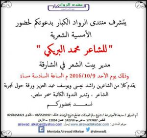 يتشرف منتدى الرواد الكبار بدعوتكم لحضور الأمسية الشعرية للشاعر محمد البريكي مدير بيت الشعر في الشارقة و ذلك يوم الأحد 9/10/2016 الساعة السادسة مساءً يقدم كلا من الشاعرين راشد عيسى و يوسف عبد العزيز ورقة حول تجربة الشاعر , و تدير الندوة سحر ملص أم السماق/حديقة الأميرة رحمة/شارع سالم العبدلات تقاطع شارع الريحانة هاتف 065529397 www.alrewadalkebar.com alrewad_alkebar@yahoo.com