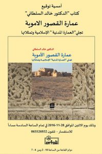 حفل توقيع كتاب الدكتور خالد السلطاني "عمارة القصور الاموية" في جاليري الاورفلي للفنون وذلك يوم الاثنين الموافق 28-11-2016 في تمام الساعة السادسة مساء تلفون: 065526932