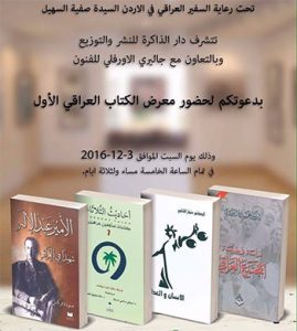تحت رعاية السفير العراقي في الاردن السيده صفية السهيل معرض الكتاب العراقي الاول - دار الذاكرة للنشر والتوزيع في جاليري الاورفلي - عمان يوم السبت الموافق 3-12-2016 في تمام الساعة الخامسة مساء يستمر المعرض لثلاثة ايام تلفون: 065526932