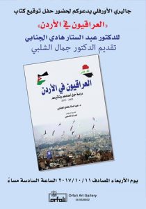 A book signing by Dr. Abdulsattar Hadi AlJanabi "Iraqis in Jordan" Hosted by Dr. Jamal AlShalabi On Wednesday Oct. 11th, 2017 at 6:00 pm For info please call 065526932 حفل توقيع كتاب الدكتورعبد الستار هادي الجنابي "العراقيون في الأردن" تقديم الدكتور جمال الشلبي يوم الأربعاء المصادف 2017/10/11 الساعة السادسة مساءً للاستفسار تلفون 065526932