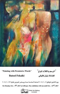 An art exhibiton by Batool Fekaiki "Painting with Permissive Words" On Monday Oct. 9th, 2017 at 6:00 pm. For info please call 065526932 معرض الفنانة بتول الفكيكي "الرسم بالكلام المباح" يوم الاثنين 2017/10/9 الساعة السادسة مساء للاستفسار تلفون 065526932