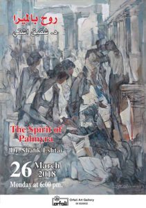 An Art Exhibition by Dr. Shafik Eshtai "The Spirit of Palmyra" On Monday March 26 at 6:00 pm The exhibition will run until April 14, 2018 Working hours 10-2 pm, 4-8 pm daily except for Fridays and Holidays For info please call 065526932 معرض د. شفيق اشتي "روح بالميرا" يوم الاثنين الموافق 2018/3/26 الساعة السادسة مساء يستمر المعرض لغاية 2018/4/14 أوقات الدوام من الساعة 10-2 ظهراً و من 4-8 مساء ما عدا أيام الجمعة و العطل الرسمية تلفون 065526932