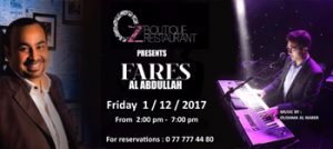 OZ Boutique Restaurant Presents Fares AlAbdullah Friday 1/12/2017 From 2:00pm-7:00pm For Reservations: 0777774480
