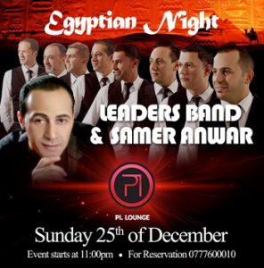 Come and celebrate Christmas with us at Pi Lounge on Sunday the 25th of December and enjoy our live music performances and fine dining experience with the talented Star Samer Anwar and the Leaders Band. For reservations please call 0777600010