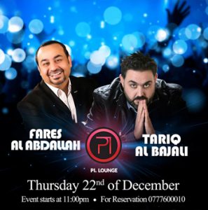 Faris Al-Abdallah & Tariq Al-Bajali @ Pi Lounge & Bar On Thursday the 22nd of December, 2016 - 11:00pm onward Are you ready for an unforgettable night with mind blowing tunes? Join us with the talented performers Fares Al Abdallah and Tariq Al Bajali Hurry up and book your tables now by calling us at 0777600010.