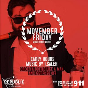 DJ I.Saleh @ Republic On Friday 4/11/2016 - 8:00pm onward Movember is here! So bring your groomed stache, put on your best pants and head down to ROE for MOVEMBER FRIDAY! Enjoy some chilled early hours music by the awesome DJ I.SALEH! For bookings, call 0798007911