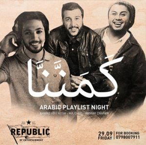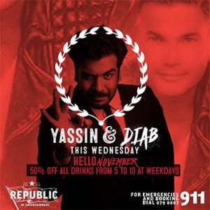 Ahmad Yassin & DIAB @ Republic On Wednesday 23/11/2016 Get ready to be blown away by the amazing Ahmad Yassin & the mesmerizing voice of DIAB taking over our stage! So gather your friends and let there be a big crowd this WEDNESDAY at ROE! *Happy Hour is from 5 – 10pm! Doors open at 10:00 Call us for bookings, 0798007911
