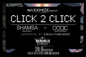 Click 2 Click a new chapter of nightlife presents by Maxximize live at Republic. A one night with full of grooving,closing the summer madness featuring Shamsa+Dodic supporting by Sheva&Funk Noise. Doors Policy: Couples&Mixed Group 21+. Guest List Only. Entrance 10JD. RSVP: 079 66 51 51 6 maxximize@gmx.us