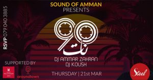 This Thursday, 21st of March, SOUND OF AMMAN presents 90Nat at Steel Lounge & Terrace | Grand Millennium Hotel Amman Featuring + DJ AMMAR ZAHRAN + DJ KOUSH • Doors open at 8PM. • Entrance 10 JOD at the door. • No minimum order on the tables. • More info & reservation 0790403885 This event supported by Aroundtown