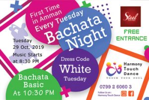 Join us on TUESDAY 29 October for First BACHATA NIGHT in Amman @ Steel FREE ENTRANCE Core Music : Bachata songs Secondary Music : Salsa Songs Bachata & Salsa Music Starts : 8:30 PM Every Tuesday Bachateroooooo COME TO HIT THE DANCE FLOOR BACHATA & SALSA Music By : Harmony Touch Team See you there! ---------- TOUCH YOUR SOUL ------ KEEP Dancing