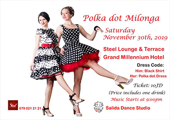 Polka Dot Milonga!!! November Saturday 30th.. Milonga will be held at Steel Lounge and Terrace / Grand Millennium Hotel. Dress Code: Him: Black Shirt - Her: Polka Dot Dress Time: 9:00pm - 12:00am Entrance Fee: 10JD (Price includes one drink) Music starts at 9:00pm Come and join us with your black shirts and dotted dresses, and let's share an enjoyable night over a huge variety of tandas! Don't forget your cameras ;)! Salida Dance Studio