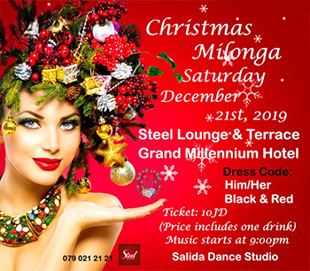 Beautiful Dancers... Holidays are coming closer, and time for Christmas magic with red sparks added to some tango! Christmas Milonga Saturday, December 21st, 2019 Ticket: 10JD (Price includes one drink) Dress Code: Look fancy and enjoy yourself with Black & Red! Music starts at 9:00pm Let's celebrate Christmas with tango embraces! Salida Dance Studio