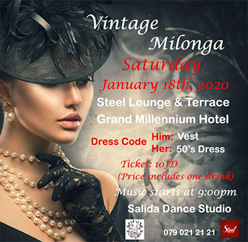 Beautiful dancers... Vintage milonga for January, 2020.. Different tandas will be played for a new 2020..filled with different energy this time! Steel lounge and terrace. Grand mellinium hotel. Ticket: 10JD (Price includes one drink) Dress code: Him/vest Her/vintage dress (50's style). Music starts at 9pm. Bring your friends, partners and your dance shoes and let's celebrate tango on the first month of the year! Waiting for you all to embrace the dance floor Salida Dance Studio