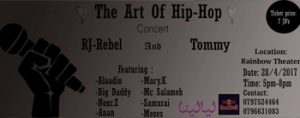 " The Art Of Hip-hop " RJRebel - Tommy Concert . * Location : Rainbow Theater. * Date : 28 of April * Time : 5:00pm - 8:00pm * Main artists : - RJRebel - Tommy * Featuring - Alaadin - Marry.K - Big Daddy - Emcee Salameh - Nour Zuraiqi - Samurai - Anan - Moses - Lana Kayed * Popping show. * Breakdance Show. * Drum Show by Trix. * DJ Sparta. * Regular ticket : 7JD's * …