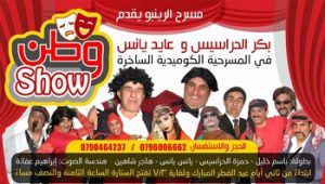 بكر الحراسيس و عايد يانس في المسرحية الكوميدية الساخرة وطن شو للحجز و الاستفسار 0796006662 - 0790464237 بطولة: باسم خليل - حمزة الحراسيس - يانس يانس - هاجر شاهين هندسة الصوت: ابراهيم عفانة ابتداءً من ثاني أيام عيد الفطر المبارك و لغاية 3/7/2017 تفتح الستارة الساعة الثامنة و النصف مساءً