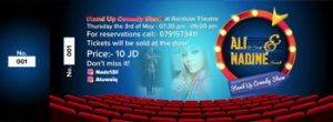 Amman Comedy Night is back! Get ready for another hilarious night with Ali & Nadine, 2 Jordanians living the Jordanian struggle and laughing at it. Join us at Rainbow Theater on Thursday, May 3rd and laugh with us, spread the word and invite all your friends. ***Tickets are available now*** For reservation call 0791573411 Tickets are also sold at the door Ticket Price: 10 JDs The show is in English