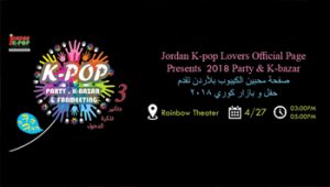 ندعو معجبين الكيبوب بالاردن من كل مكان لمشاركتنا اجمل احتفالاتنا واجتماعاتنا لهذا العام هذا الحفل مخصص لكم (الفانز) فقراتنا الجديدة لنتفاعل وياكم و نشارك حبنا للفن الكوري ولفرقنا المفضلة , ننتظر منكم الحماس وكل الدعم والتشجيع :) ولا تنسوا المسابقات الرائعة المجهزة لكم , سيتم الاعلان عنها عن طريق هذا الايفينت واي تفاصيل اخرى تجدونها هنا . نريد من الجميع مشاركة الايفينت ليكبر المرح اكثر ولتواجد اكبر عدد ممكن :) ايضاً البازار الكوري اي سيكون هناك بازار منوع لاشهر الفرق …