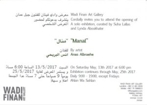معرض وادي فينان للفنون جبل عمان يتشرف بدعوتكم لحضور المعرض الشخصي منال للفنان انس البريحي السبت 13/5/2017 الساعة 6:00 مساءً و يستمر المعرض لغاية 25/5/2017 يومياً 9 صباحاً حتى 7 مساءً عدا الجمعة أهلا و سهلا Wadi Finan Art Gallery Cordially invites you to attend the opening of A solo exhibition, curated by Suha Lallas and Lynda Aboukhater Manal By Artist Anas Albareahe On Saturday May 13th 2017 at 6:00 pm Exhibition continues through May 25th 2017 Daily 9:00 - …