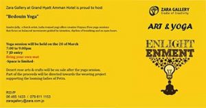 Art and Yoga @ Zara Gallery On Monday 20/9/2017 - at 7 PM - 9 PM Zara Gallery at Grand Hyatt Amman Hotel is proud to host “Bedouin Yoga" Sandra Jelly, a Dutch artist, India trained yogi offers creative Vinyasa Flow yoga sessions that focus on balanced movements guided by intention, rhythm of breathing and an open heart. Yoga session will be held on the 20 of March 7:00 to 9:00pm 7 JD entry Bring your own mat -Space is …