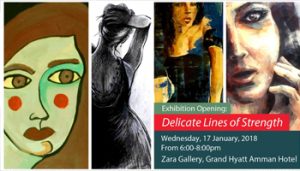 Zara Gallery, Grand Hyatt Amman Hotel,is please to present group exhibition by upcoming Jordanian artists: Leena Baker, Mahan Abu Saman, Yasmeen Al-Kurdi, Nisreen Haddadin. Beauty, power, sensitivity, strength, fragility, confidence, passion, curiosity, mystery and an endless set of feelings driven by the inner and outer worlds of females -as reflected through the eyes of the artists and expressed each in their artistic style and technique, through applying large brush strokes, solid lines, vibrant, and soothing colours, minimalist or complicated approach, …