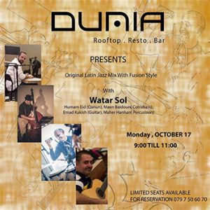 Original Jazz Mix and Live Fusion Night with Watar Sol @ Dunia Rooftop On Monday 17/10/2016 - 9:00pm - 11:00pm Limited seats available For reservation or for more information please call: 0797506070