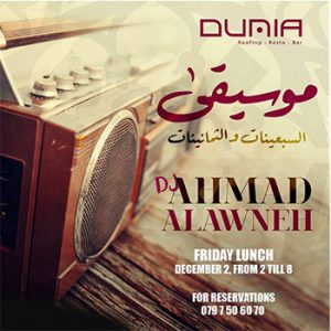 70's & 80's with DJ Ahmad Alawneh @ Dunia Rooftop موسيقى السبعينات والثمانينات مع دي جي احمد علاونة @دنيا رووف توب On Friday Lunch 2/12/2016 - 2:00pm till 8:00pm For reservation or for more information please call: 0797506070