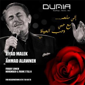 In memory of Melhem Barakat (Featuring Ziad Malik & DJ Alawneh) @ Dunia Rooftop On Friday 4/11/2016 - from 2:00pm till 8:00pm For the memory of the greatest Legend Milhim Barakat we will sing ....a special tribute performance by the lovely voice of Ziad Malik and DJ Alawneh و يبقى ملحم بالقلب For reservation or for more information please call: 0797506070