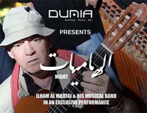 Elham Madfai & his musical band @ Dunia Rooftop On Thursday 18/5/2017 - 9:00pm onward The Meastro of Arabic Oriental Fusion Ilham Al Madfai is back to Dunia in one Exclusive performance on Thursday along with his musical band .... dont miss it For more information or for reservation please call on 0797506070
