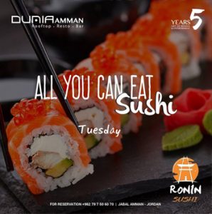 All You Can Eat Sushi Night @ DUNIA Rooftop On Tuesdays - 8:00pm till 12:00am Dunia Sushi Nights are Back this Tuesday with our Open Sushi Buffet starting from 8 til 12 PM Price is 20JD inclusive!