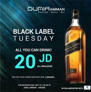 BLACK LABEL TUESDAY ALL YOU CAN DRINK! 20 JD ALL INCLUSIVE ASK FOR YOUR COMPLEMENTARY RIDE CAREEM FOR RESERVATION +962 79 7 50 60 70 JABAL AMMAN-JORDAN