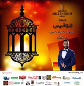 خيمة فوانيس فندق الميلينيوم يوم الثلاثاء مع نجم XFactor الفنان كريم منير ومفاجأة في انتظاركم الاماكن محدودة سعر التذكرة ٥ دنانير للحجز ٠٧٧٧٧٧٧٥٧٥