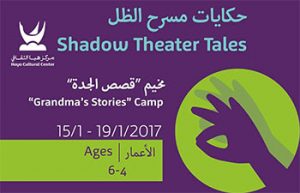 Grandma's Stories Camp @ Haya Cultural Center From 15/1/2017 Until 19/1/2017 يستمع الأطفال الى قصص الجدة والقصص الشعبية التي تغرس بداخلهم القيم الجميلة، ثم يختارون قصتهم المفضلة ليحولونها الى عرض لمسرح الظل يستمتع به الكبار والصغار على حد سواء! Children will absorb beautiful life values while enjoying storytelling sessions of grandma’s stories. They will pick their favorite tale and adapt it to a modern shadow theater performance for an audience of different ages to enjoy. For more information: 065688633