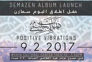 SemaZen Album Launch Concert @ Haya Cultural Center Thursday, February 9, 2017 - at 7:30 PM - 10 PM حفل إطلاق البوم سمازن "ذبذبات ايجابية" @ مركز هيا الثقافي انضمولنا وتعالو شاركو معنا، تعالو زي ما انتو، من وين ما انتو، بكل الوانكم واختلافاتكم، انضموا لدائرتنا، انضموا لعائلة سمازن، لنغني مع بعض وانخلي ذبذباتنا تصير وحدة، وصوتنا يصير واحد وانطير سوا! انضمولنا احنا عاطف وروان (سمازن) يوم الخميس الموافق 9 شباط على مسرح مركز هيا الثقافي (شميساني) لأمسية من العمر …