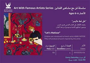 Art with Famous Artists "Lets Matisse" Workshop @ Haya Cultural Center Starting on 4/2/2017 - 4:30pm فنان هذا الشهر هو "هنري ماتيس"! انضموا الى سلسلة دورات "فن مع مشاهير الفنانين" وتعرفوا على أشهر أعماله وانتجوا أعمالا فنية مستوحاة من أسلوبه المميز. Our artist for this month is “HENRY MATISSE “! Join our “Art with Famous Artists” courses series and get to know his famous works and produce artwork inspired by his unique style.