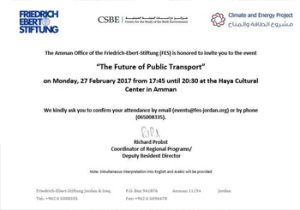 اطلاق دراسة حول مستقبل النقل العام في الاردن التي اجرتها مؤسسة فريدريش ايبرت بالتعاون مع مركز دراسات البيئة المبنية وتتناول التحديات والانجازات في هذا القطاع الحيوي من وجهة نظر المسؤولين والمشغلين.