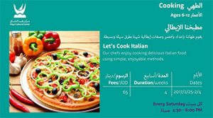 "Italian Cuisine" Workshop @ Haya Cultural Center Starting 4/2/2017 - 4:30pm "مطبخنا الإيطالي" هو موضوعنا لهذا الشهر! بادروا بالتسجيل في برنامج الطهي مركز هيا الثقافي واستمتعوا بتحضير وجباتكم بأنفسكم! “Let’s Cook Italian” is our theme for this month! Register in our cooking program and enjoy preparing your own meals