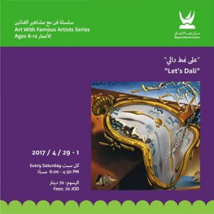 يتعرف أطفالنا على المدرسة السريالية في الفن، وعلى أبرز أعلامها، الفنان الاسباني "سلفادور دالي" سنستوحي أعمالنا الفنية بتقنية مختلفة في كل جلسة، كالرسم والتلوين والنحت والتشكيل وغيرها. انضموا الينا This month’s artist is Spanish SALVADOR DALI, a prominent founder of the Surrealism school of art. Inspired by some of his most famous works, each session children will do their own works using different techniques including painting, coloring and sculpting. Join us! الشريك الاستراتيجي Zain Jordan Strategic Partner