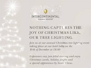 Christmas Tree Lighting Celebration @ InterContinental Aqaba Resort On 10/12/2016 - 6:00pm Join us on the for a Tree lighting to celebrate the joy of Christmas taking place at our hotel lobby. Experience cozy fun-filled evening and enjoy Christmas carols, holiday jingles and a special appearance by Santa Claus.