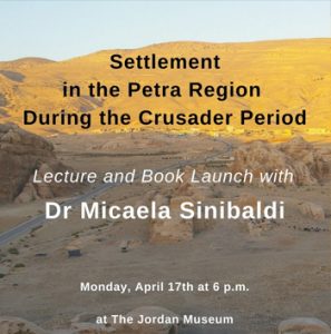 The Council for British Research in the Levant In partnership with the Jordan Museum Presents a public lecture: Settlement in the Petra Region during the Crusader Period Dr Micaela Sinibaldi Followed by the launch of the book Crusader Landscapes in the Medieval Levant: The Archaeology and History of the Latin East Monday, April 17th at 6 p.m. at The Jordan Museum -------------------------------------- About the lecture It is well documented by historical sources that during the 12th century the Franks established …