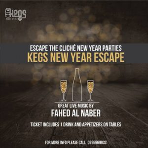 NYE Party 2017 @ Kegs - House of Ale Fed up with the same old New year events every year? We are too! Say Hello to 2017 differently with us and enjoy great music by Fahed Alnaber. Tickets include Appetizers and 1 Drink For more information please call 0795669933