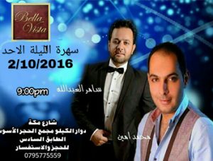 Saad Abu Tayeh & Bashar Al-Sheikh @ Bella Vista cafe سهرة الليلة السبت 12/11/2016 النجم الاردني المحبوب سعد ابو تاية النجم الاردني المحبوب بشار ألشيخ برفقة المبدعين فرقة ابو عون الموسيقية اقوى عروض الشهر بس عنا في بيلا فيستا كافية ارجيلة + سوفت درنك او وجبة عشاء + سوفت درنك بس في 10 دنانير للعائلات فقط فقط فقط للحجز والاستفسار: 0795775559 شارع مكة دوار الكيلو مجمع الحجر الأسود الطابق السادس
