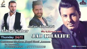 Jad Khalifeh & Ashraf Saber & Jafar Omari @ Nagham Restaurant, Royal Hotel كونوا معنا اليوم الخميس 24/11/2016 في مطعم نغم فندق الرويال عمان مع النجم اللبناني جاد خليفة و امير الاحساس والرومانسية النجم اشرف صابر والنجم المتألق جعفر العمري في اجمل سهرة فنية واجواء عائلية مميزة واشهى الاطباق اللبنانية للحجز: 0777722229 - 0799994567