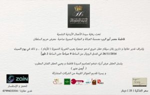 تحت رعاية سيدة الاعمال الاردنية النشمية : فاطمة معمر ابو الرب مصممة العبائة والجلابية المميزة صاحبة معرض حريم السلطان باشراف غدير حلاوة ودارين بلان سيقام حفل خيري لدعم جمعية يعرب الخيرية التنموية (الايتام) ذالك في يوم السبت 26/11/2016 بفندق الرويال من الساعة 9 صباحا حتى الساعة 2 ضهرا يشمل الحفل عرض ازياء ضخم لتصاميم السيدة فاطمة ويحي الحفل الفنان (ايمن منير) ويسرنا تقديم جوائز قيمة من الشركات المشاركة سعر التذكرة (25) دينار ** نشكر جمعية Elaph Volunteer لمساعدتنا واشرافهم على …