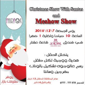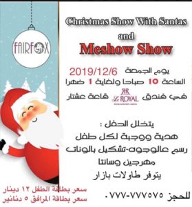 حفلة الاطفال بمناسبة عيد الميلاد ستكون في فندق الرويال بتاريخ ١٢/٨ حفلة مميزة وهدايا قيمة Meshow Show with Santas بوفيه وهدية لكل طفل مقدمة من سانتا سعر البطاقة للطفل ١٠ دنانير وللمرافق ١٠ دينار يتوفر طاولات بازار للحجز وشراء البطاقات الاتصال مع شركة Fairfox For Events ٧٧٧٥٧٥-٠٧٧٧