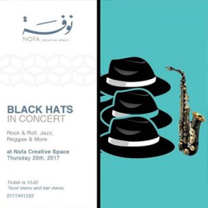 BLACK HATS BAND @ Noofa Creative Space Join us for a Live music of Rock & Roll , Jazz, Reggae & more . We will start at 8:30pm till 10:00pm. Bar and food menu will be available. Ticket 15 JD For bookings call or text 0777401222.