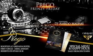 Frenzy Friday with DJ Amroo Malhas @ Prego On Friday 4/11/2016 - 8:00pm until 1:00am Loads of Promotions troughout the Day: Stolichnaya RED - JD 45.00 Inclusive Stolichnaya Gold - JD 55.00 Inclusive Stolichanya Elit - JD 110.00 Inclusive Carakale Beer Pint - JD 4.00 Inclusive Special Menu & Happy Hour from 5PM - 8PM To Reserve call 0796533838
