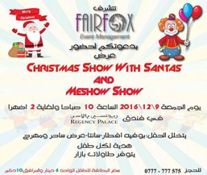 Christmas Show with Santa & Mesho Show @ Regency Palace On December 9th, 2016 - from 10:00am till 2:00pm حفلة الاطفال السنة غير شكل تعو احتفلوا معنا في فندق الريجنسي بالاس يوم 9/12/2016 عال 10 الصبح عرض الساحر ميشو لا وكمان عرض سانتا وهدية لكل طفل وكمان اشهى اكل سعر تذكرة الطفل 6 دنانير وسعر تذكرة المرافق 10 دنانير للحجز: 0777777575 يتوفر طاولات بازار
