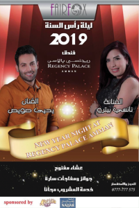 حفلة رأس السنة 2020 اسهروا معنا في فندق الريجنسي مع الفنان يحيى صويص والفنانة نانسي بيترو بوفيه مفتوح ، خدمة المشروب مجانا للحجز ٠٧٧٧٧٧٧٥٧٥