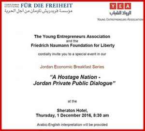 JEBS: A Hostage Nation - Jordan Private Public Dilaogue On Thursday 1/12/2016 - at 8:30 AM - 10 AM Ladies and Gentlemen, The Young Entrepreneurs Association (YEA) and the Friedrich Naumann Foundation for Liberty (FNF) have the honor of inviting you to our morning Jordan Economic Breakfast Series (JEBS): Title: " A Hostage Nation-Jordan Private Public Dialogue" Speaker: Mr. Laith Al Qasem, Chairman Arabian Business Consultants for Development ABCD Arabic-English interpretation will be provided Location: Sheraton Hotel Date: Thursday, December …